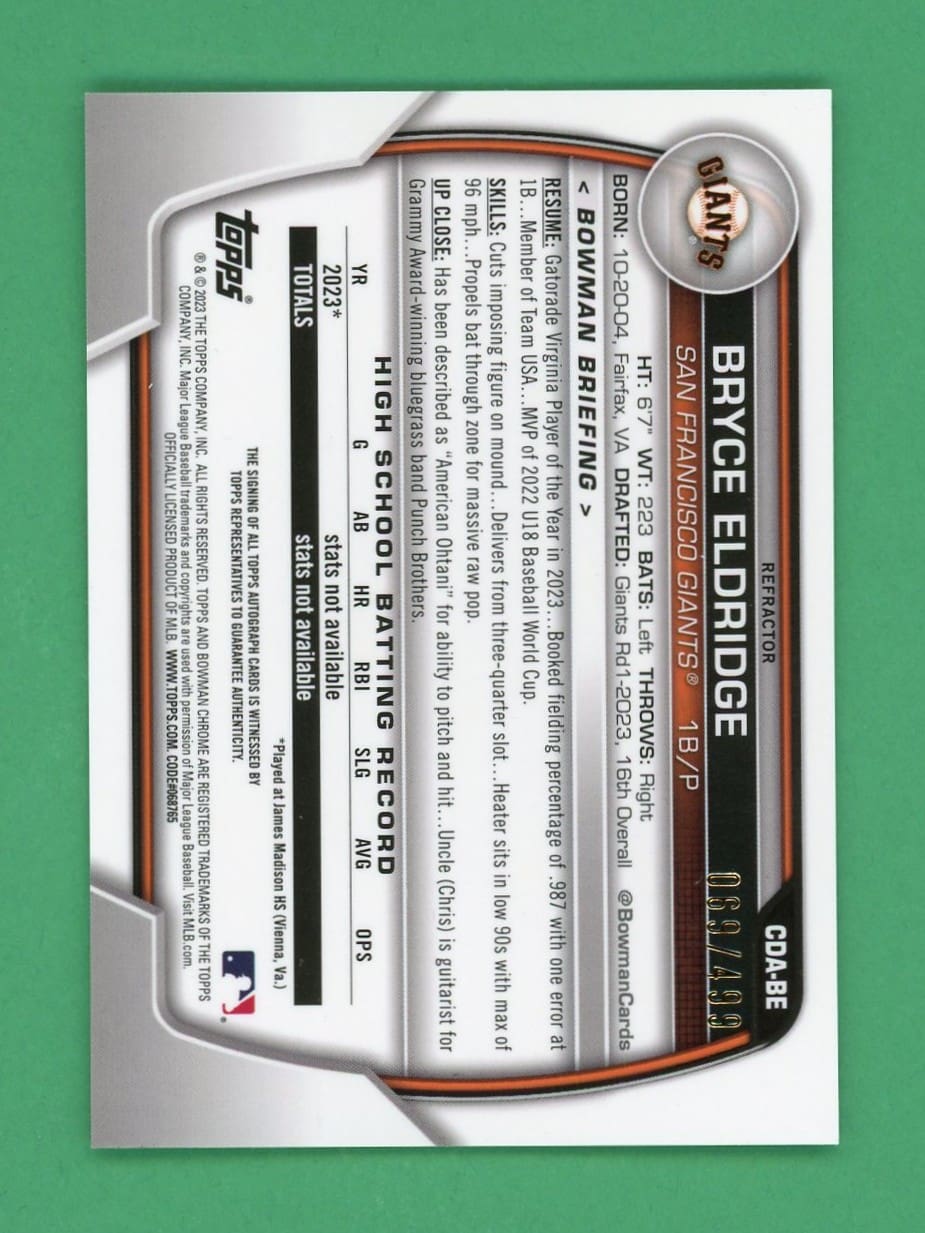 Bryce Eldridge 2023 Topps Bowman Chrome 1SR Refractor Rookie Auto /499 #CDA-BE
