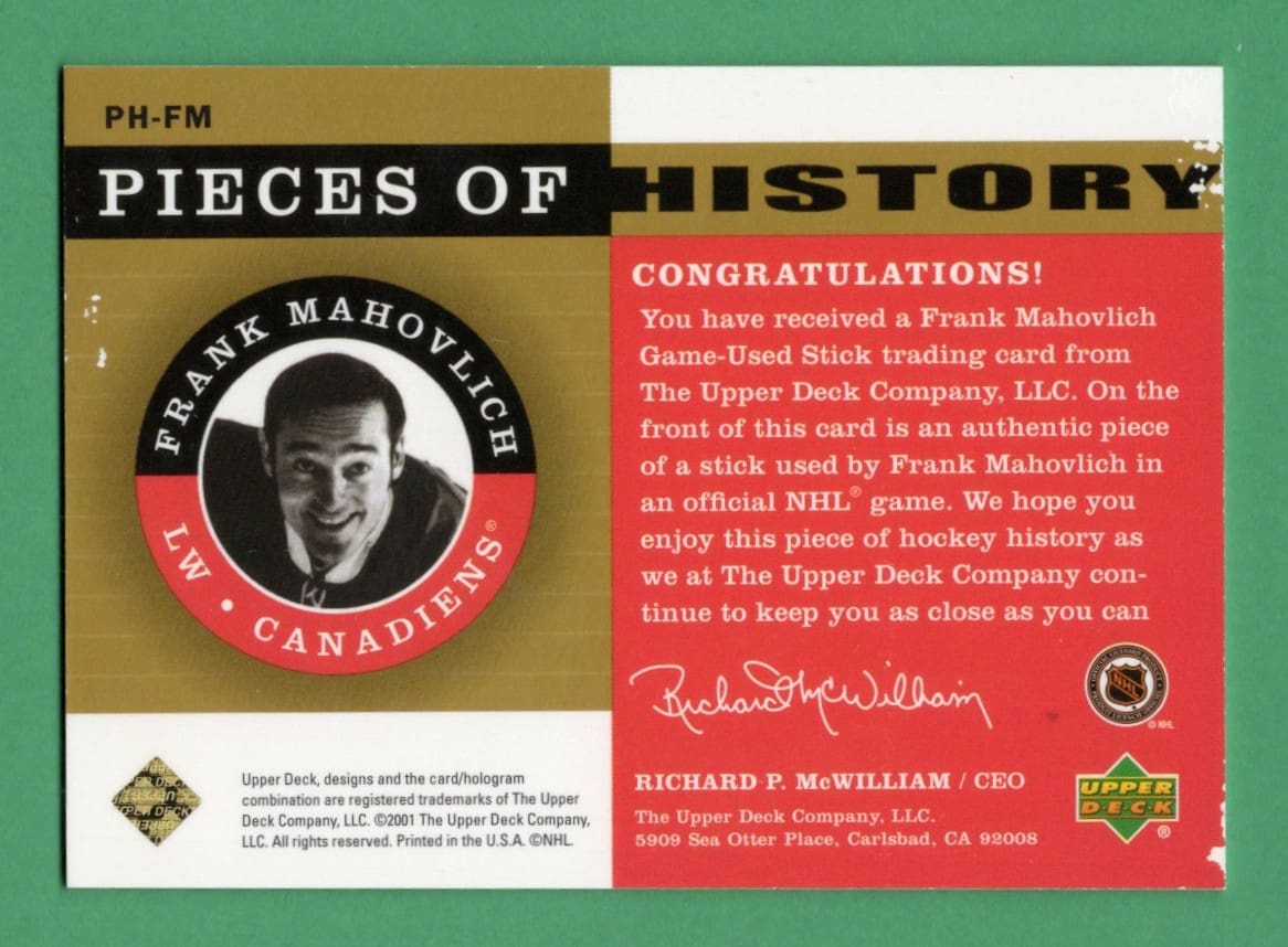Frank Mahovlich 2001-02 UD Legends Piece Of History PH-FM