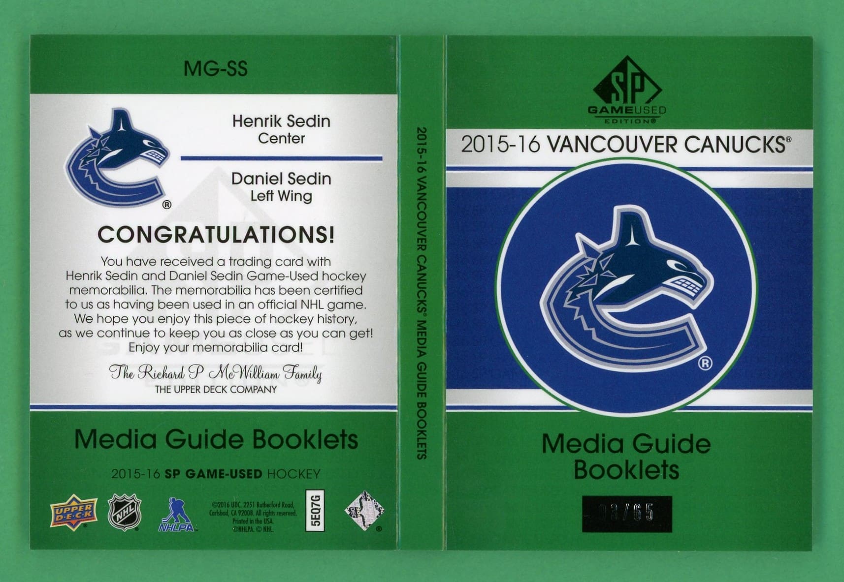 H.Sedin, D.Sedin 2015-16 Upper Deck SPGY Media Guide Booklets /65 #MG-SS