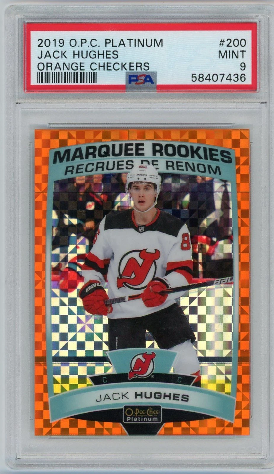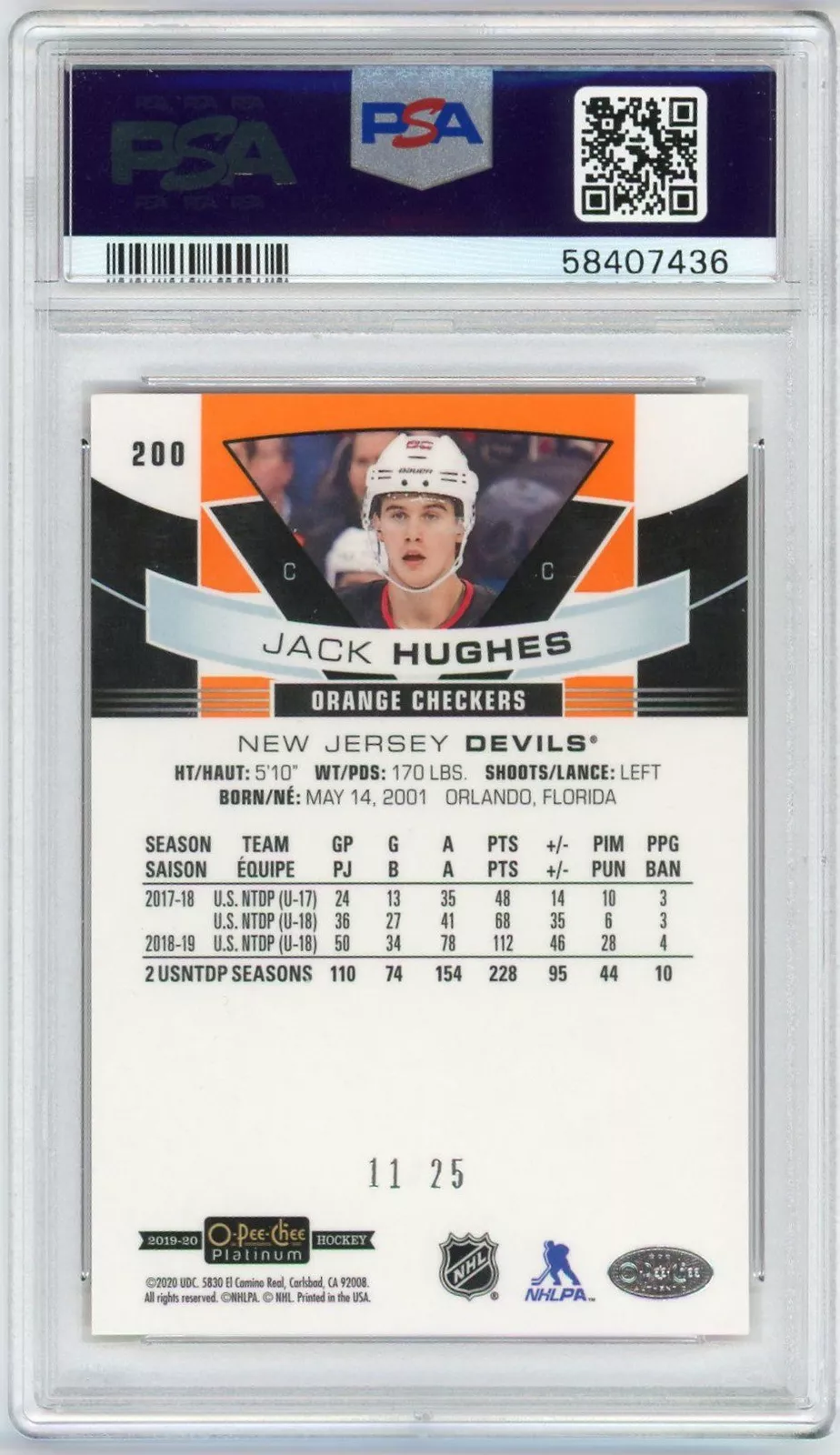 Jack Hughes 2019-20 OPC Platinum Orange Checkers Marquee Rookie /25 PSA 9 POP 3