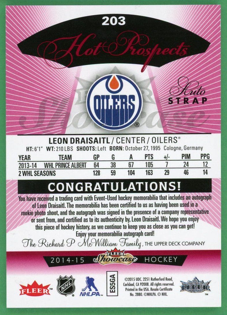 Leon Draisaitl 2014-15 Fleer Showcase Auto Strap Patch Red /18 RC #203