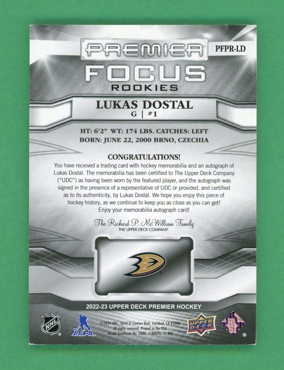 Lukas Dostal 2022-23 Upper Deck Premier Focus Rookies RPA /125 #PFPR-LD