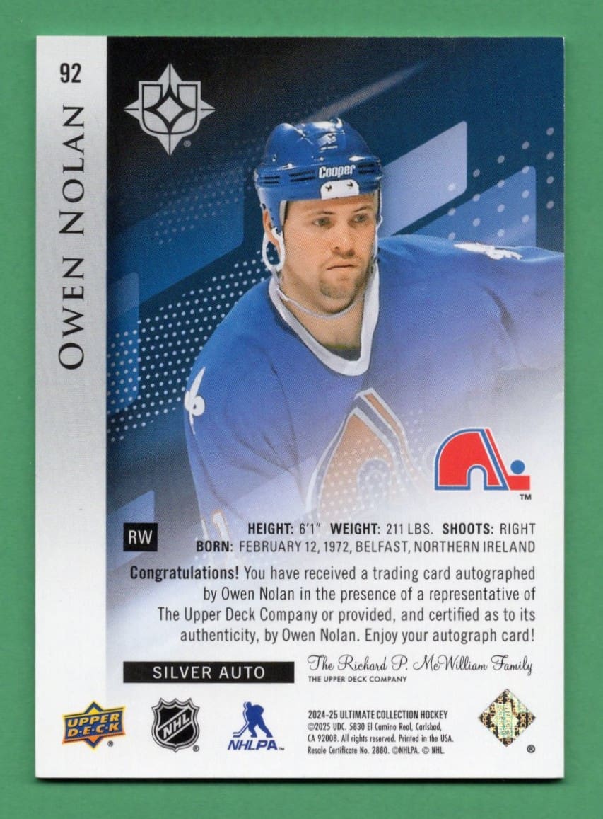 Owen Nolan 2024-25 Upper Deck Ultimate Collection Silver Auto #92