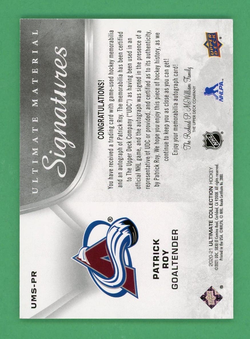 Patrick Roy 2020-21 Upper Deck Ultimate Material Signatures /25 #UMS-PR