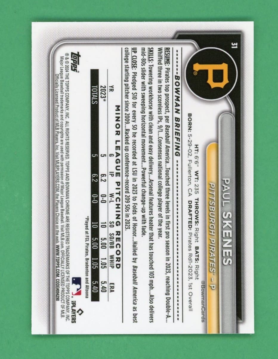 Paul Skenes 2024 Bowman Chrome Mojo Refractor Rookie Card #31